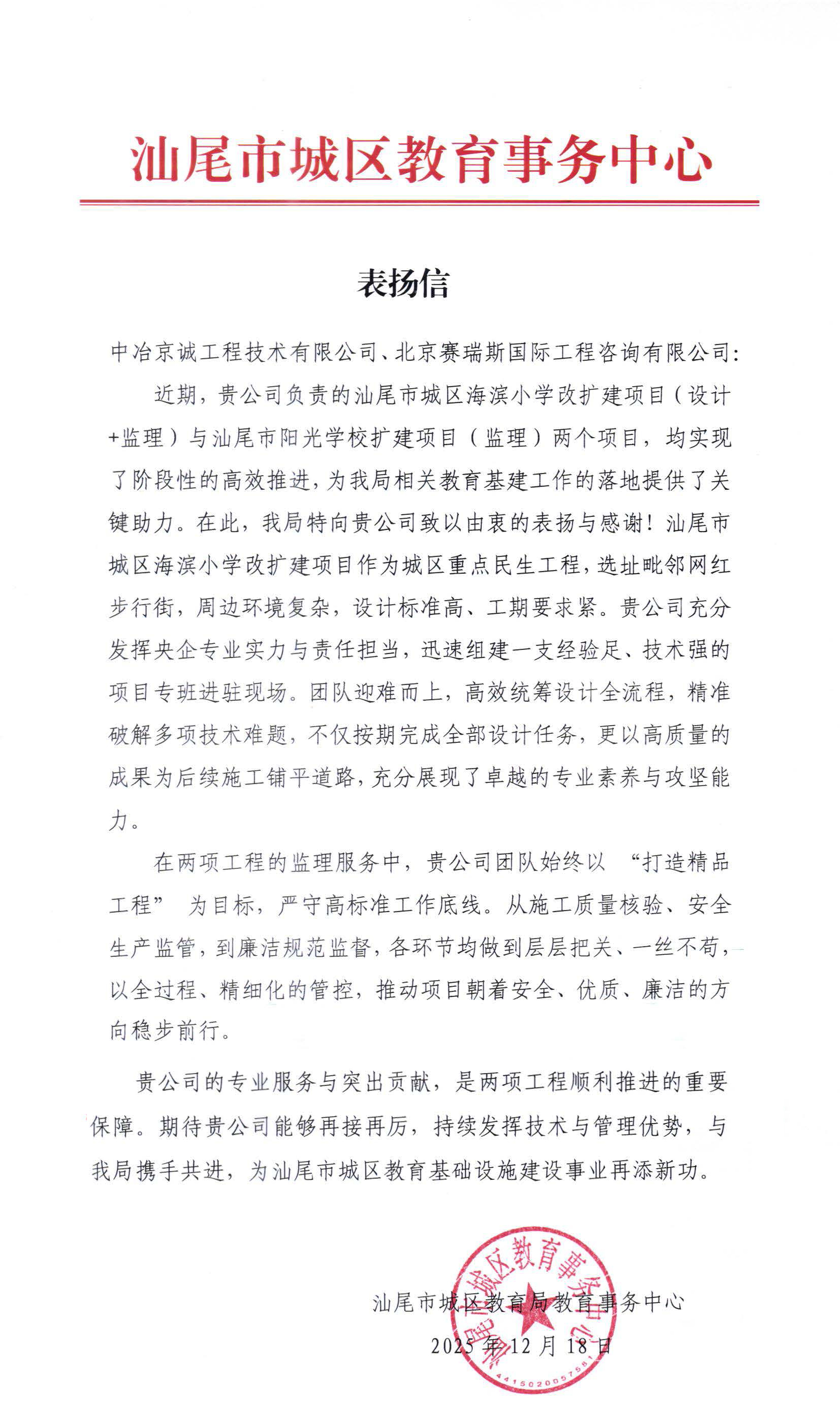 表扬信是对公司专业能力与服务水平的高度认可,同时也为后续在当地业务拓展注入强劲动力。下一步,赛瑞斯将以此为契机,进一步强化责任意识、细化工作举措、提升服务效能,全力以赴推进项目后续建设工作。同时,始终聚焦教育基建领域需求,以更高标准、更优服务助力完善汕尾市教育基础设施体系,为推动区域教育事业高质量发展贡献更大力量。